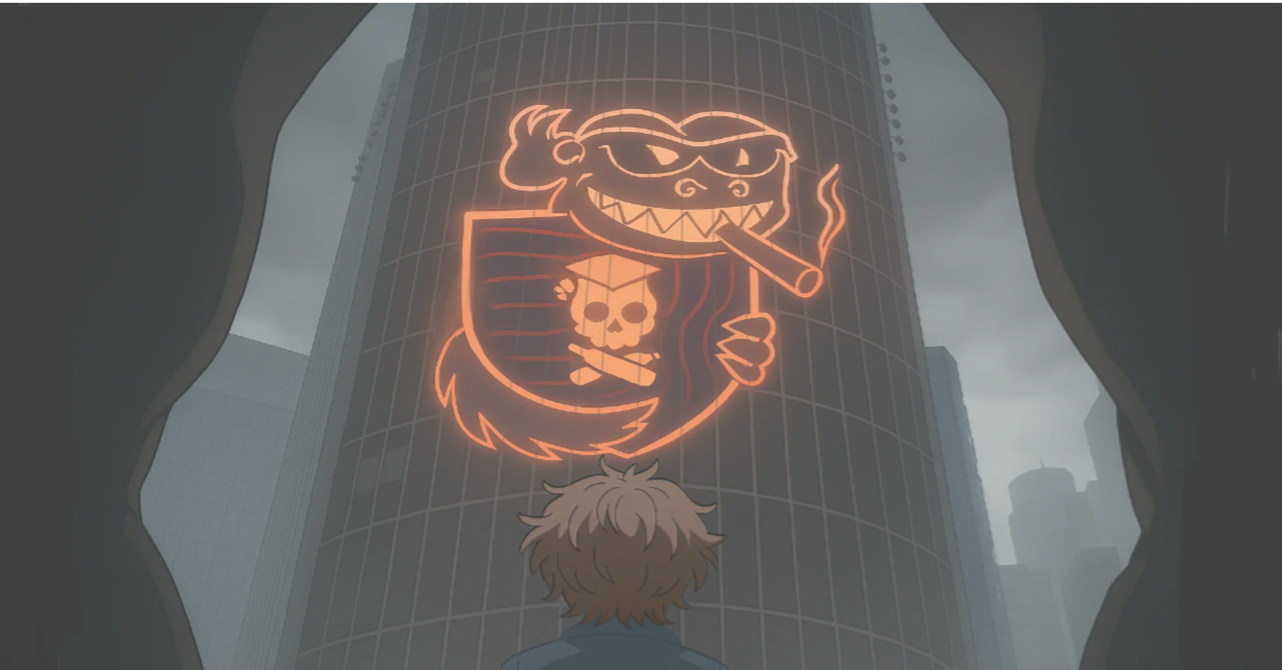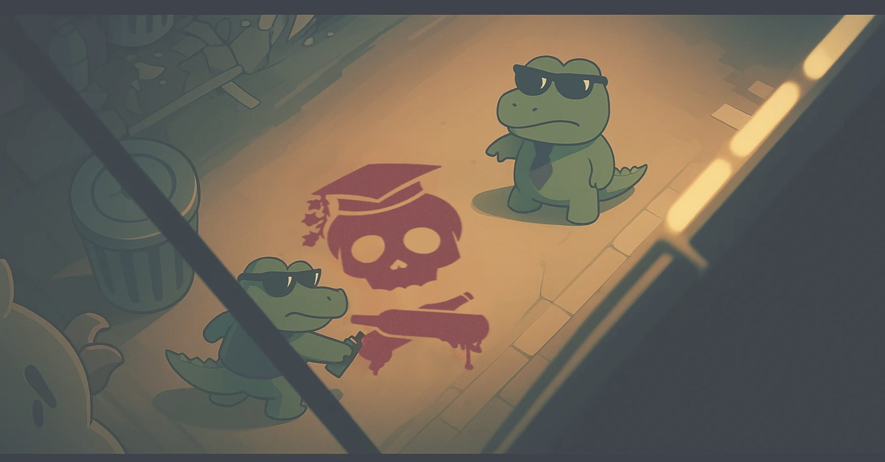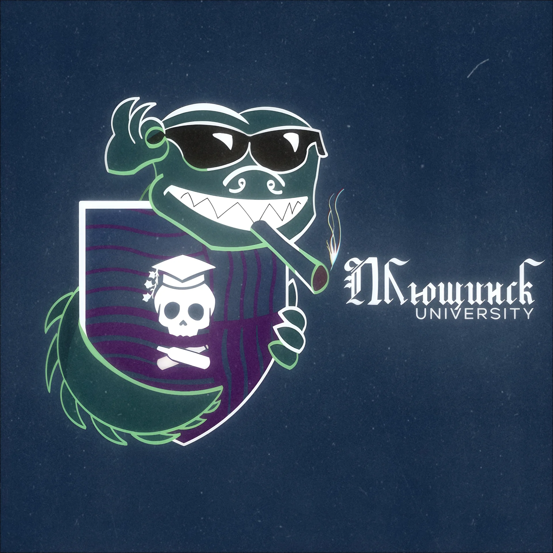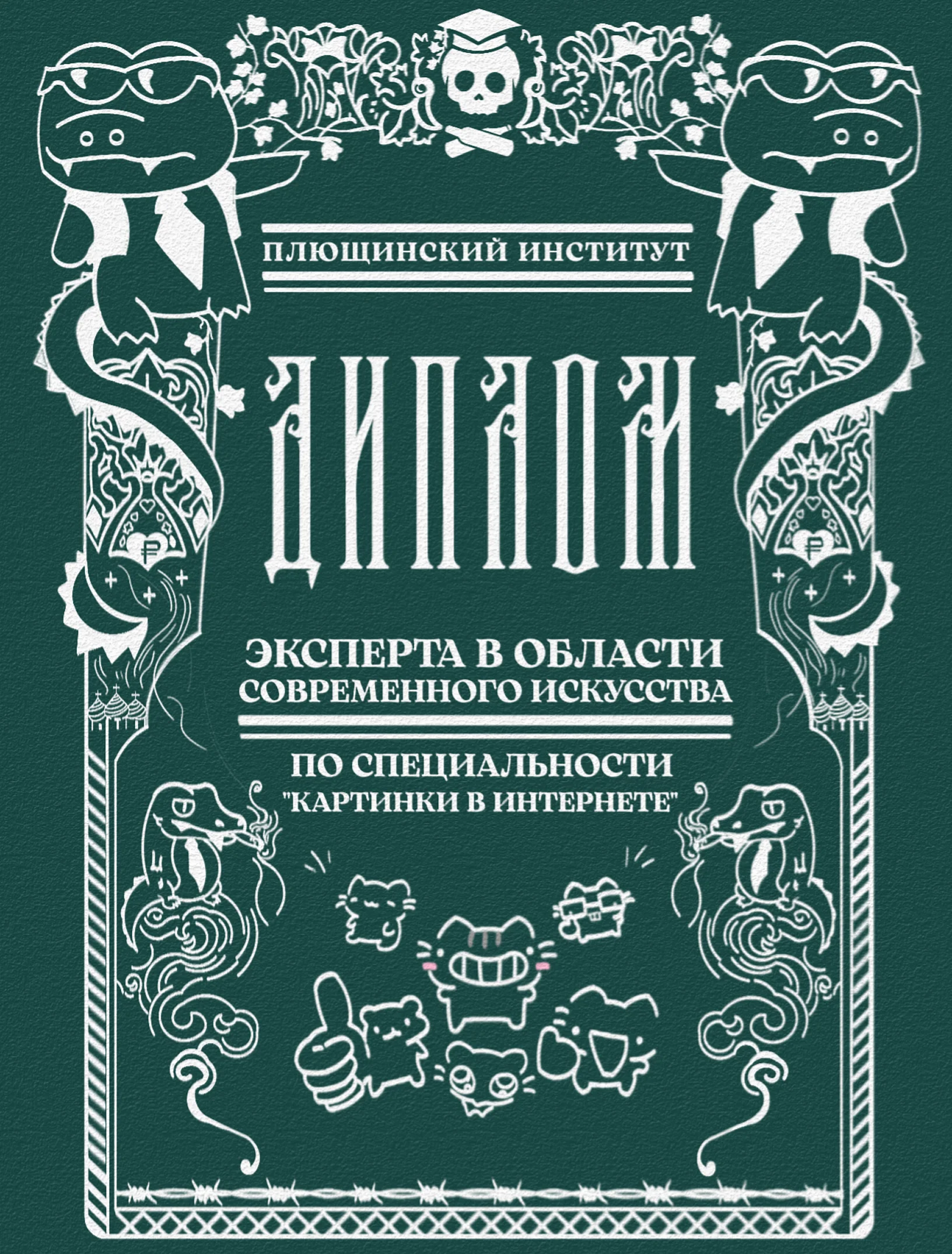 Символы — череп бакалавра, крокодильчик и плющ объединяют иронию и смысл. Череп отражает смерть пафоса и поиск живого знания, крокодил — трикстер, смеющийся над системой, а плющ — пародия на элиту и символ внутреннего роста.